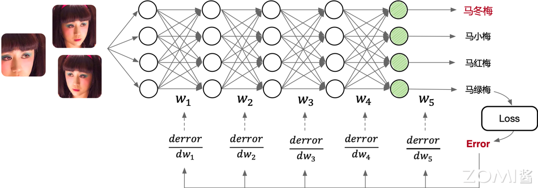因此训练过程就是根据用户给定的带有标签(如图中的多张马冬梅的照片,以及马冬梅照片对应的 “马冬梅” 这个确定性的输出标签)的数据集,不断通过优化算法进行训练学习。而训练学习则是通过下面步骤学习出给定数据集下最优的模型权重 $w_n$ 的取值。