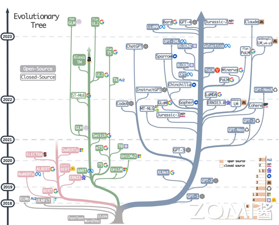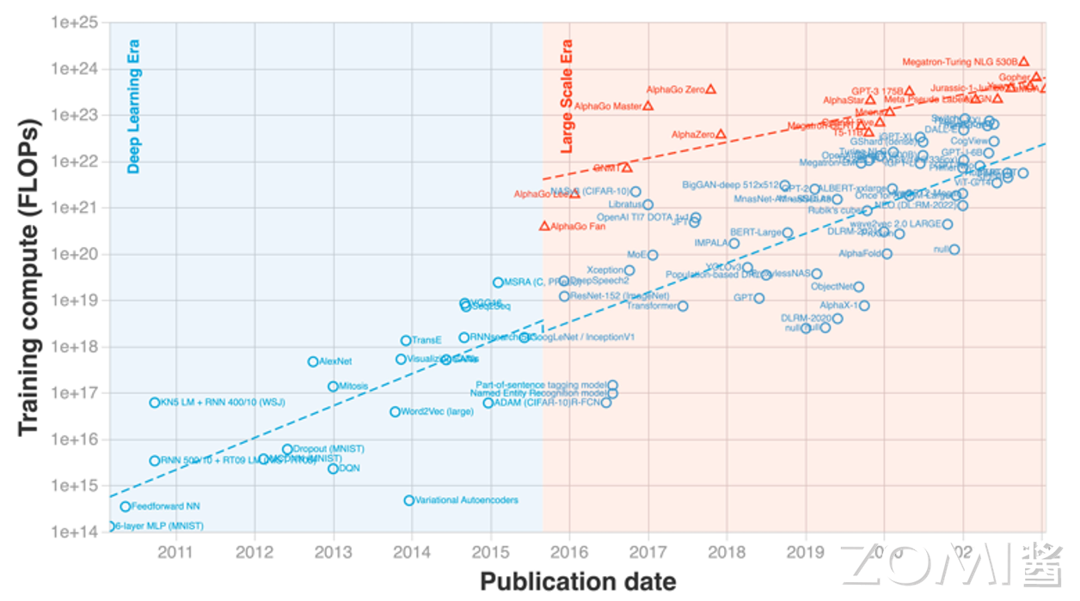 此时无论是基于 Transformer 的 Encoder-Decoder 双编码结构,亦或是类似于 BERT 和 GPT 的单编码结构,业界不断涌现出了 AELM、T5、LLAMA 及其各种变体,在大语言模型 LLM 方向百家争鸣。其模型的大小大多在 1B 以下 (如 BERT-Large 340M,T5-Large 770M、GPT-2 1.5B),训练所需的数据集大小一般不超过 10B。这样的任务,大部分高校、科研院所的有限计算资源(高性能 GPU 服务器)上使用 DeepSpeed 等分布式并行框架,都可以比较方便的训练起来。
