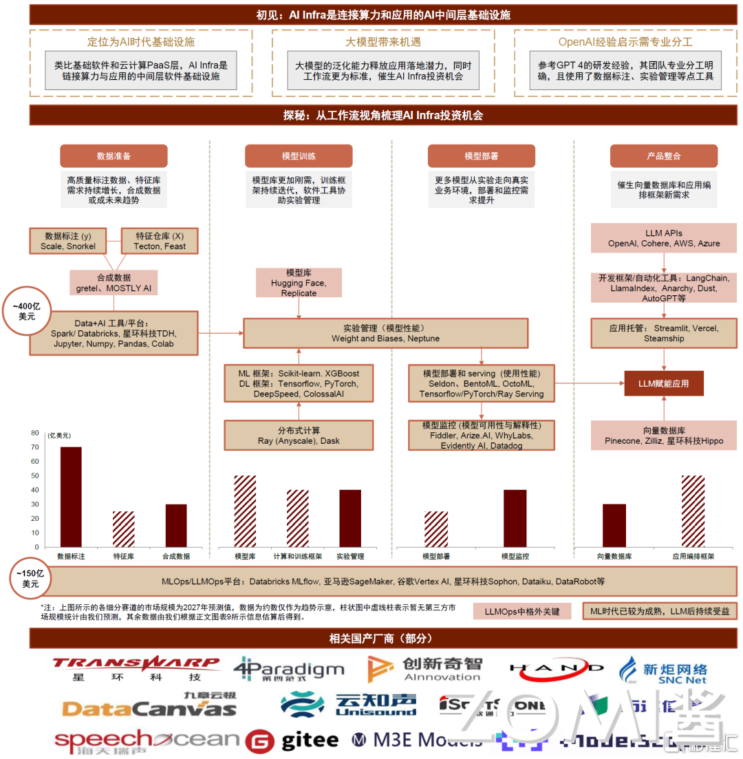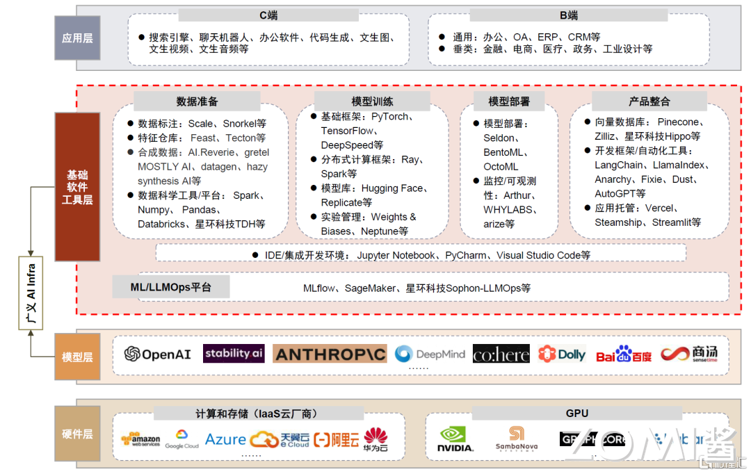 AI Infra(AI 基础设施)是连接 AI 训练推理全流程的软件应用,及 AI 中间件基础设施。主要包含大模型从设计、生产到应用等全流程所配套的横向软硬件设施。
