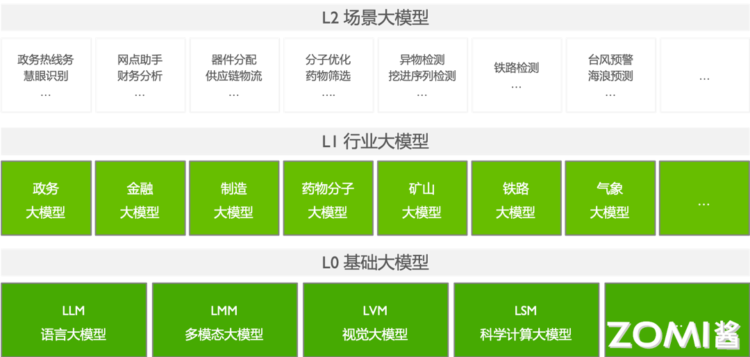 从应用领域上看,大模型可分为 L0、L1、L2 三层。其中 L0 层面是通用基础大模型,涉及到 LLM、LVM、LMM、GLM 等等,通用大模型是具有强大泛化能力,可在不进行微调或少量微调的情况下完成多场景任务,相当于 AI 完成了“通识教育”,ChatGPT、华为盘古都是通用大模型;L1 是构建在 L0 基础上面向行业进行训练的行业大模型(包含政务、金融、制造、矿山、铁路等行业),行业大模型利用行业知识对大模型进行微调,让 AI 完成“专业教育”,以满足在能源、金融、制造、传媒等不同领域的具体需求,如金融领域的 BloombergGPT、航天-百度文心等;而 L2 层则是面是面向一些具体细分行业,通过工作流等从 L1 行业大模型中抽取的符合场景需求,进行针对具体的行业数据机型微调后,使模型处于更加细分领域的场景中应用。