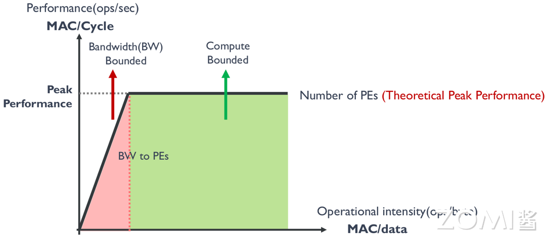 再精简的说,就是搬移数据和计算这两件事情。对硬件平台 AI 芯片来说,数据搬移的带宽和计算单元(算力)是固定的值,所以当我们拿到一个 AI 模型时候,可以根据上面提到的 FLOPs 和 MACs 概念,统计出该模型的总 FLOPs(浮点运算次数)和总 MAC(内存占用量)需求,假设用 bytes 表指代内存占用量,用 ops 指代浮点运算次数,用 bw 表示 AI 芯片的数据搬移带宽,用 \(π\) 表示 AI 芯片的 PE 个数,也就是算力。