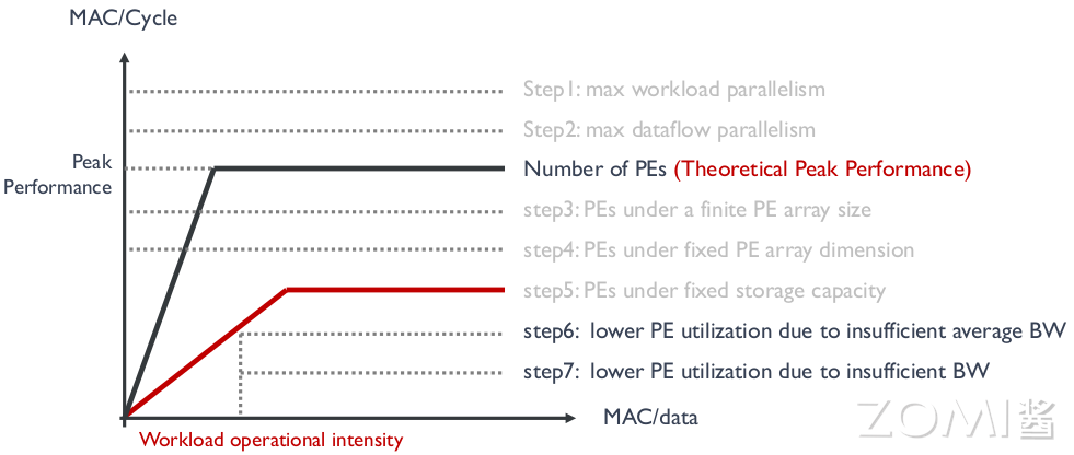 Step3, Step4:由于固定的 PE 维度或者 size, 导致有的 PE 在任务周期的不是 100% 被激活。比如有 7 个计算任务,分给 4 个 PE 执行,则需要 2 个 cycle,但是其中有个 PE 的激活率是 50%,这种情况下的计算性能就没有达到峰值性能。