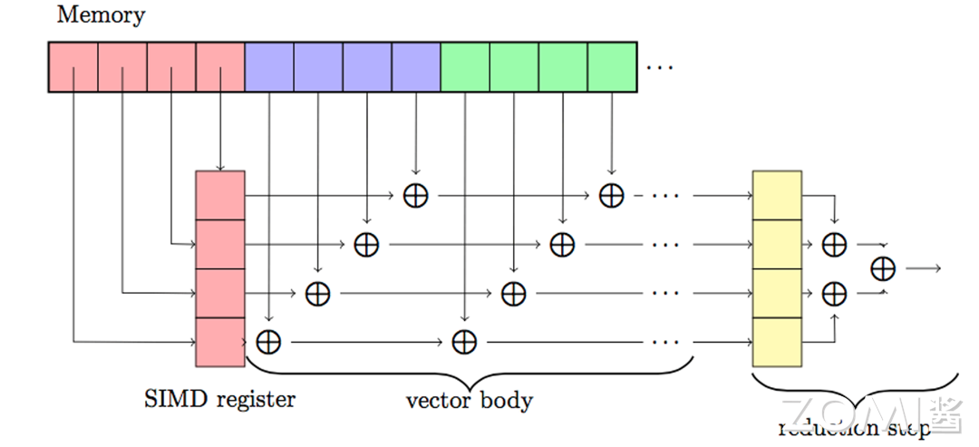 在之前的循环优化中,已经介绍过了向量化的原理,它是一种数据级并行的优化。其硬件实现如下图所示,将多个连续存储的数据批量加载进向量寄存器中,对整个向量寄存器进行操作,从而同时对多个数据元素进行了计算。