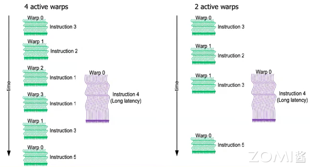 GPU 在实现延迟隐藏方面,主要依赖于其高度并行化的架构和先进的调度技术。Wrap Schedule 是一种用于管理多线程执行的技术,它允许 GPU 在等待内存操作完成时,动态地调度其他线程来继续执行计算任务。这种技术通过减少线程间的同步开销,提高了线程的执行效率。GPU 还采用了上下文切换机制,能够在不同的线程上下文之间快速切换,进一步隐藏内存访问的延迟。当一个线程因为内存访问而暂停时,GPU 可以立即切换到另一个准备好的线程继续执行,从而保持了 GPU 核心的持续工作。