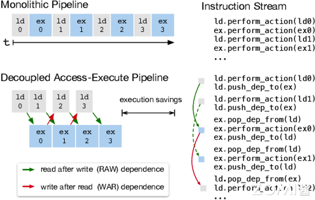 NPU 采用了解耦访问/执行(Decoupled Access/Execute,DAE)架构。在 DAE 架构中,内存访问操作和计算操作是分开进行的,允许它们并行执行而不是顺序依赖。NPU 拥有专门的硬件单元来处理数据的加载和存储,这些单元独立于执行计算的核心。当计算核心需要数据时,它会发送请求,然后继续执行其他计算任务,而数据加载操作在后台进行。在这种情况下,一般需要使用双缓冲机制,来缓存不同 LOAD 指令得到的数据。