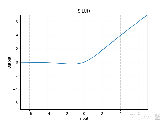 在部署网络时,首先要考虑在目标硬件平台的可行性,如果目标硬件平台不支持某个算子,那么就需要替换为相似的受支持的算子。例如在 YoloV5 中,默认的激活函数为 SiLU,SiLU 的计算公式涉及自然指数和除法,对 FPGA 硬件非常不友好,其函数曲线如下: