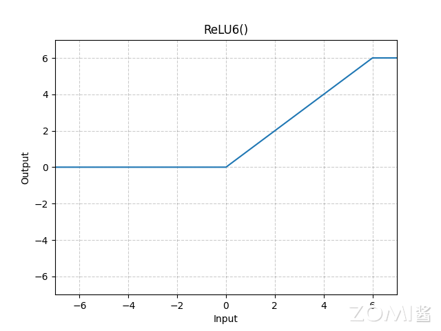 而 YoloV5 中还提供了其他的激活函数如 ReLU6,其函数曲线如下图。经过实验发现二者在精度上面并无太大差异,而 ReLU6 的计算方式则简单的多,可以用 ReLU6 来替换 SiLU。