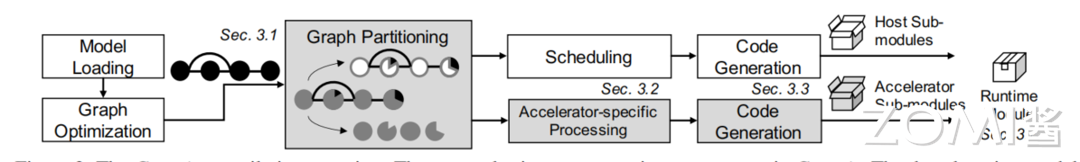 在划分之后,一个图被分割成多个不同后端处理的区域,在 host 上的区域可以有效利用从现有的深度学习编译器中进行的标准优化,然而卸载到加速器的区域可能需要一些特定于硬件的优化(例如融合、替换、存储布局转换、量化等),这些优化通常是专有的,无法在深度学习编译器中处理。