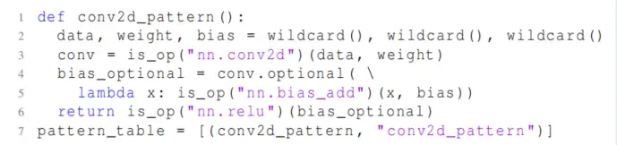 该框架提供了模式匹配机制,如下代码描述的匹配一个 Conv2d-add-relu