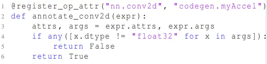 在根据模式将 node 进行分组后,下一步是根据编程模型指定支持的算子列表。例如下代码注册了一个函数,指示所有浮点类型的 Conv2D 节点被注释并卸载到 MyAccel 中