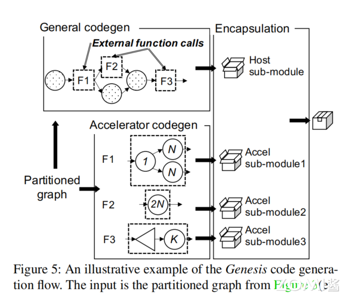该框架通过遍历图并为每个图节点调用相应的代码生成来生成一个子模块。当遍历到 host 上的节点时,可以利用现有深度学习编译器中的代码生成,如 TVM 和 XLA,它们能为通用设备(如 CPU 和 GPU)生成代码。当遍历到特定 target 标注的节点(即划分函数)时,生成一个外部函数调用作为运行时内核调用的 hook。同时调用加速器特定的代码生成,其包含了硬件供应商提供的代码生成工具和编译流,为该节点中的划分函数生成一个“加速器子模块”。