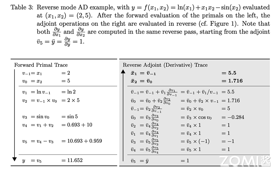 可以看出,左侧是源程序分解后得到的基本操作集合,而右侧则是每一个基本操作根据已知的求导规则和链式法则由下至上计算的求导结果。